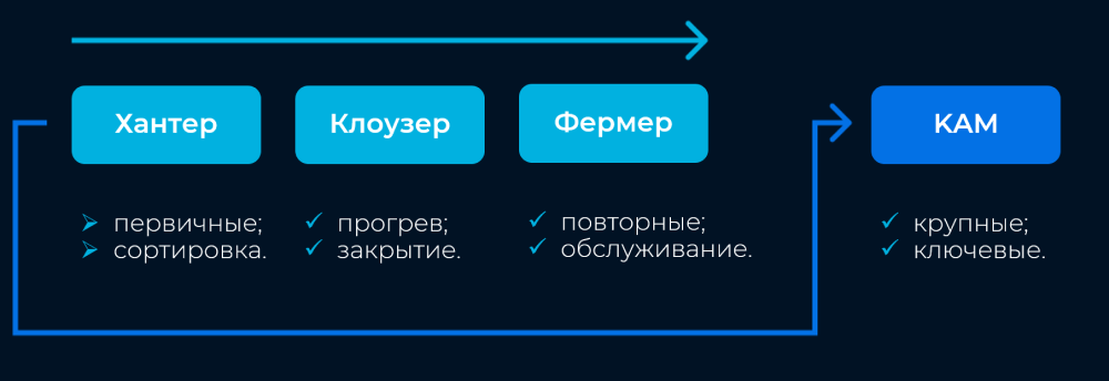 Для старта достаточно двух ролей: хантера и клоузера-фермера. Это позволит эффективно распределить обязанности и повысить управляемость процесса продаж. По мере роста компании можно добавить роль KAM для работы с крупными клиентами.