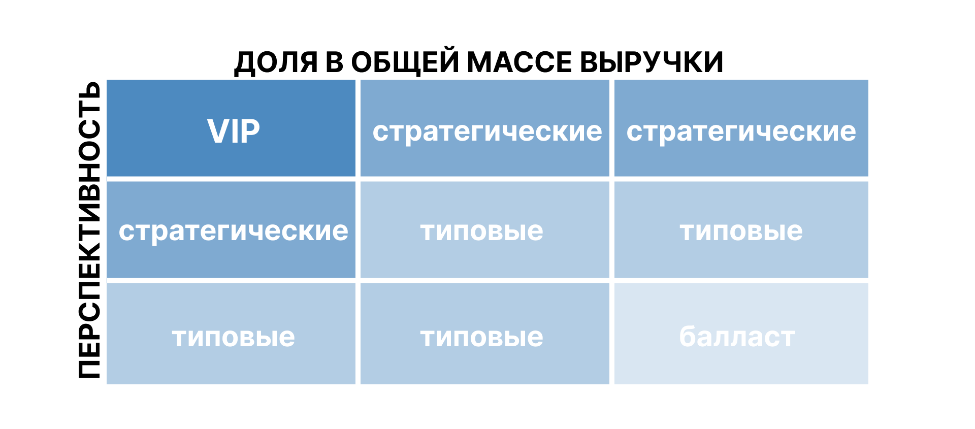 Коль скоро мы сегодня говорим о B2B-продажах, разберем базовые критерии сегментации аудитории для продаж. Как правило, это доля выручки от клиента в общем объеме и перспективы развития клиента. Первый критерий легко выяснить в рамках ABC-анализа, второй – с помощью оценки менеджеров и руководителя ОП.