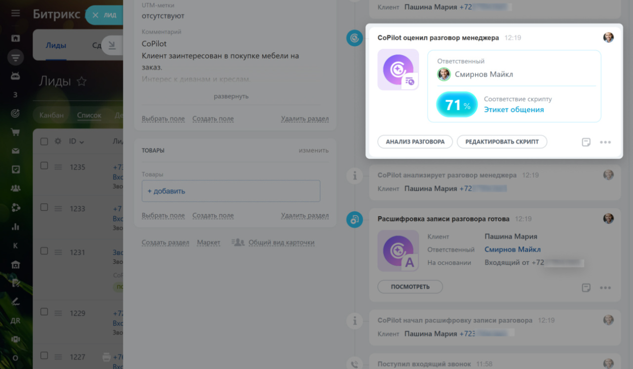 - Скрипты продаж и речевая аналитика с AI в CRM, которые помогают создавать скрипты и проверять следование им сотрудниками.