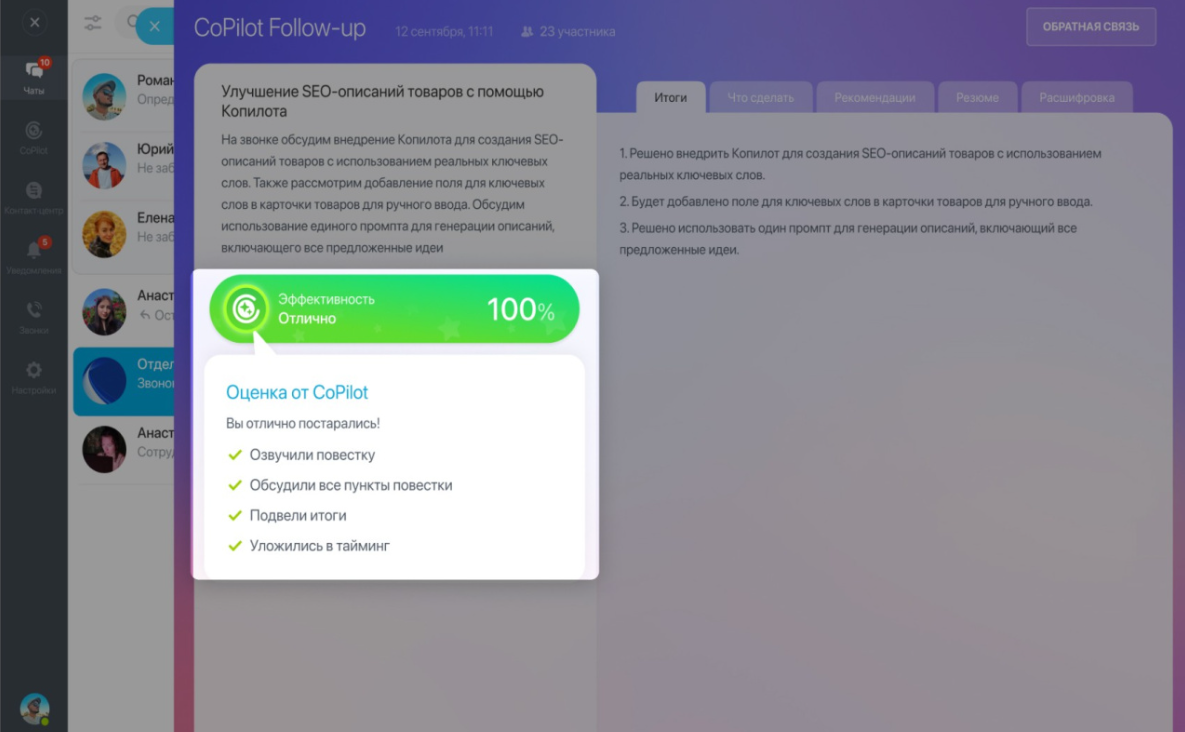 - CoPilot Follow-up – нейросеть, которая подводит итоги звонков и совещаний и дает развивающую обратную связь.