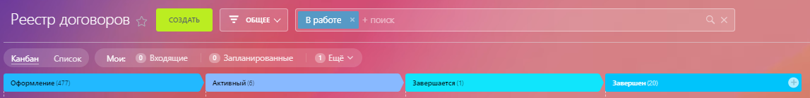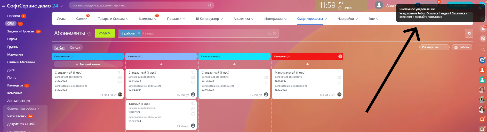 Итак, предположим, что у вас появился новый клиент по подписке или абонементу. После того, как он оплатил первый абонемент, в процессе «Абонементы» создается сделка. В нашем случае, на стадии «Оформление», т.к. абонемент нужно активировать. После того, как нужные действия по активации произведены, сделка перемещается на стадию «Активны». Когда приближается срок истечения абонемента, сделка автоматически перемещается на стадию «Завершается». При этом, в нашем случае, ответственному автоматически приходит уведомление о том, что нужно связаться с клиентом и продлить абонемент или подписку. Здесь можно настроить любые действия, в том числе автоматическую отправку сообщения со ссылкой на счет, а также выставить сроки, когда производить эти действия. В нашем случае, это за неделю до окончания. Абонементы, которые не были продлены, в нашем примере помещаются на стадию «Завершен». Таким образом, при необходимости, можно связаться с этими клиентами и реактивировать их.