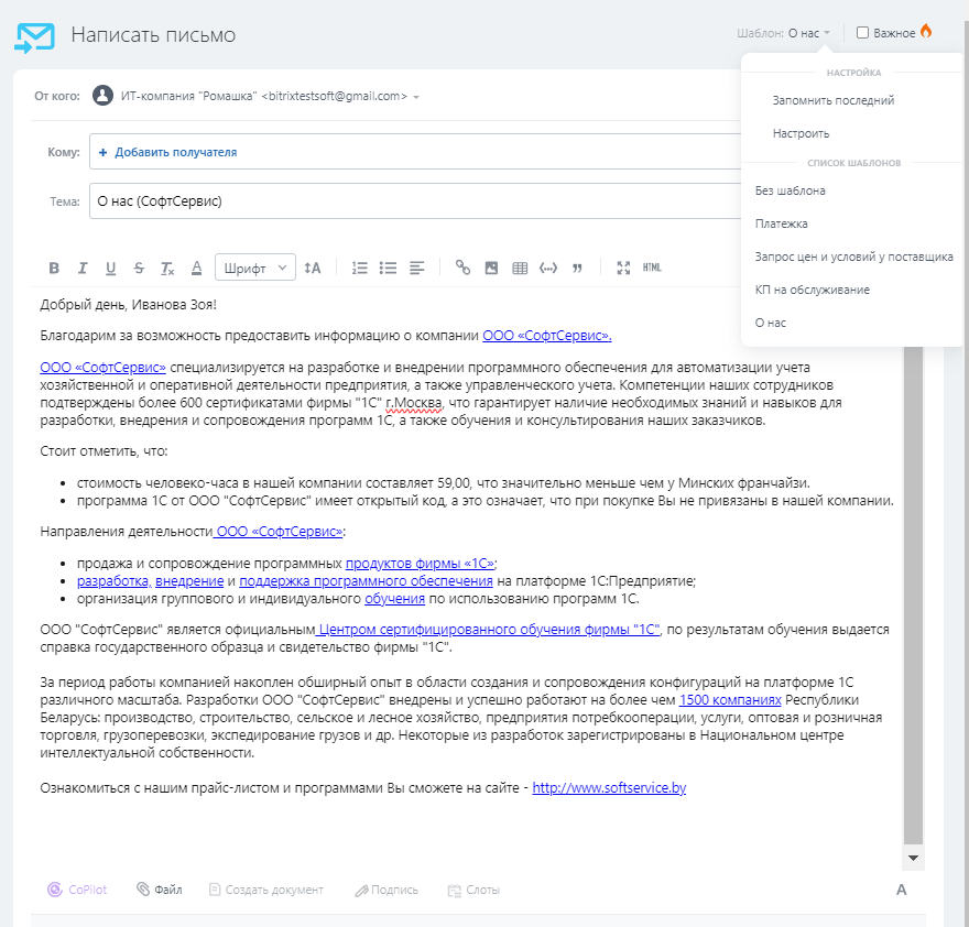 Шаблоны писем для ручной отправки нужны в случаях, когда для менеджера есть необходимость добавить что-то от себя. Часто это: